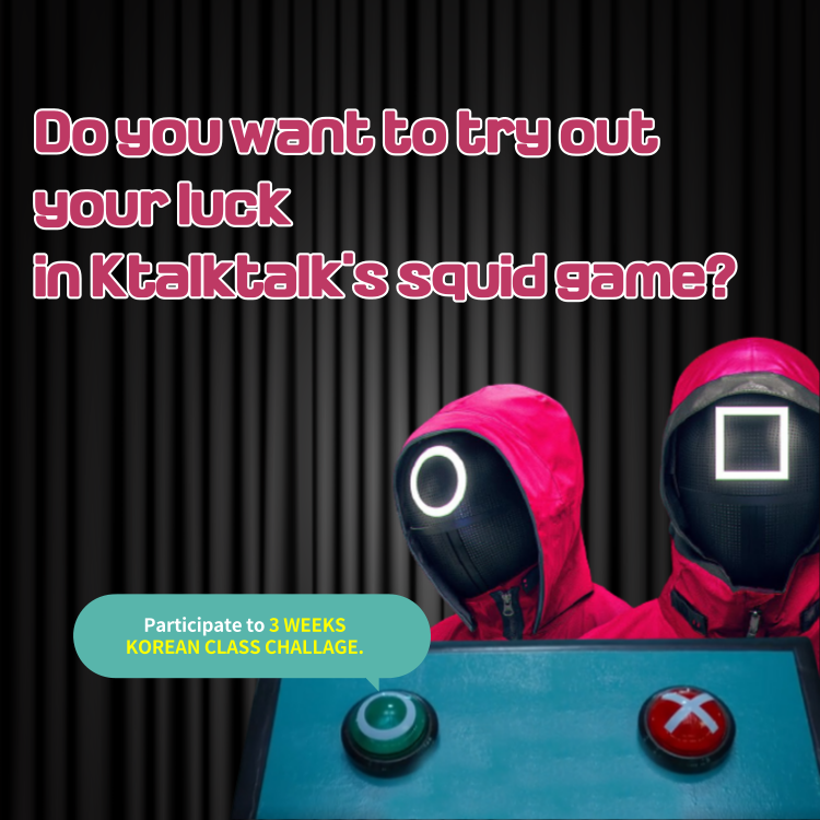 GAME RULES : - Once you are selected as a game participant, a Zoom link will be sent to you. You can participate in the class via the link in the e-mail. - There are four classes in every week for three weeks (total 12 lessons). All classes are held at midnight (00:00) in Korean time. Please check the time difference in advance. - Every participant must attend 12 classes in total. If you miss or are late for any class, you are automatically eliminated from this challenge. There is NO EXCEPTION. - If you turn off the camera during class, you will be eliminated. - Homework will be given after class. Students who do not do their homework will also be eliminated from the game. - There are NO EXCEPTION for any Internet issues or other situations. - All classes will be recorded and uploaded to Ktalktalk's YouTube and Instagram the next day. If you can't show your face, you can't participate this event. (Please refer to Precaution for application)